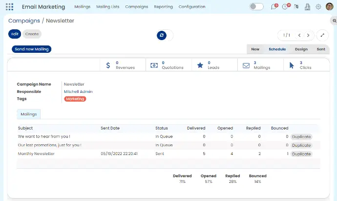 Follow your opportunities through CRM and analyze the conversion rate, the expected revenue and the generated revenue of each of your campaigns. Use filters for more in-depth analysis.