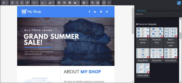 Use our pre-made building blocks to structure your email. Insert headers and footers, calls-to-action, images, links, snippets and many more in just a few clicks.